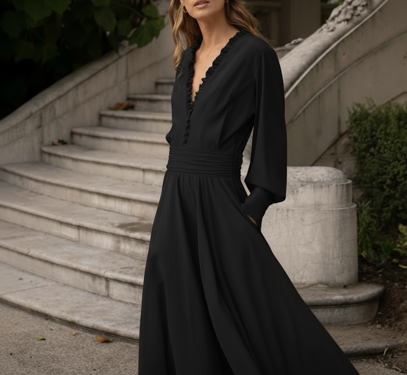 Abito lungo con scollatura a V e volant, cintura con pieghe, bottoncini ricoperti, gonna a ruota intera e maniche con polsi alti chiusi da bottoncini sempre ricoperti.