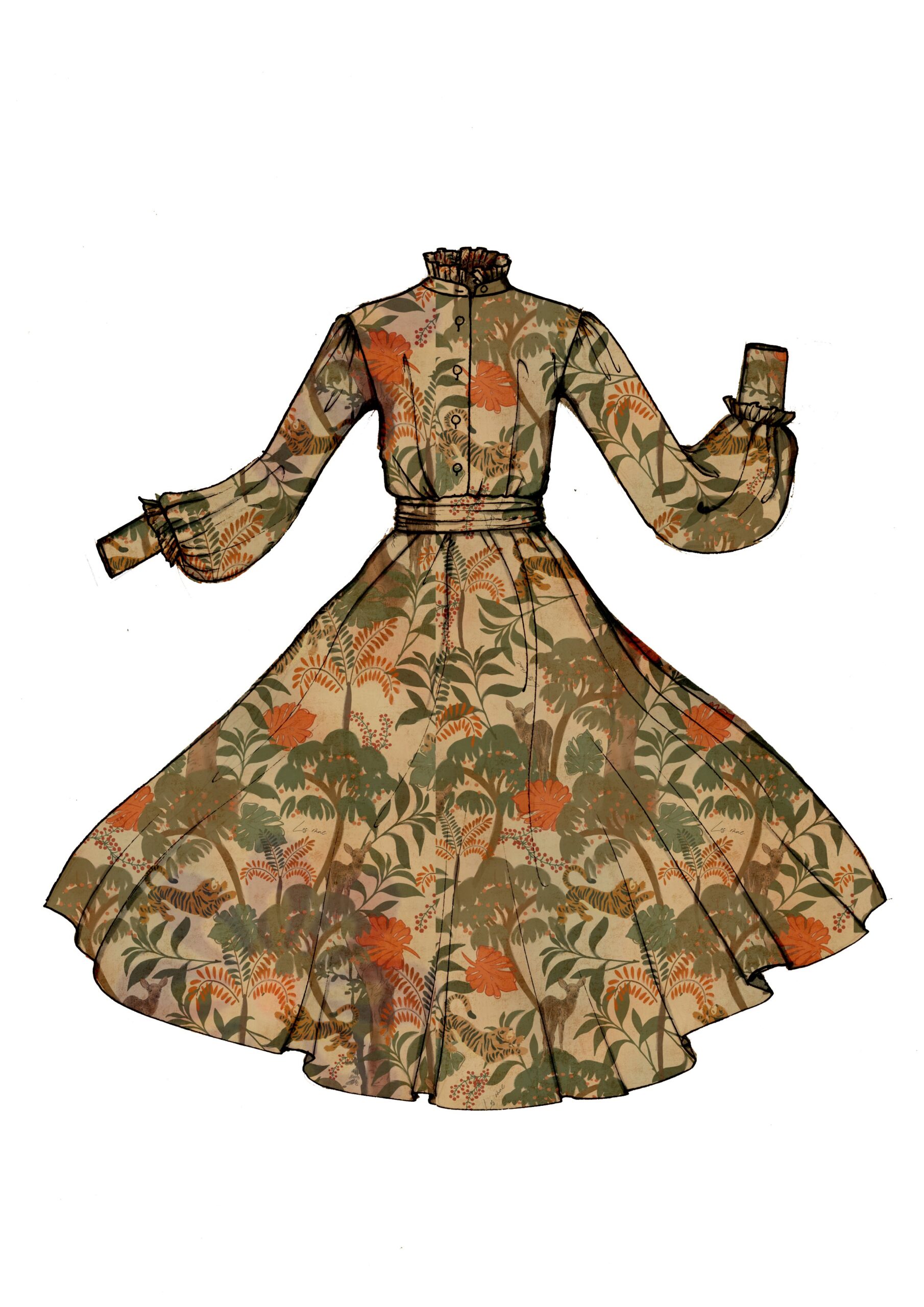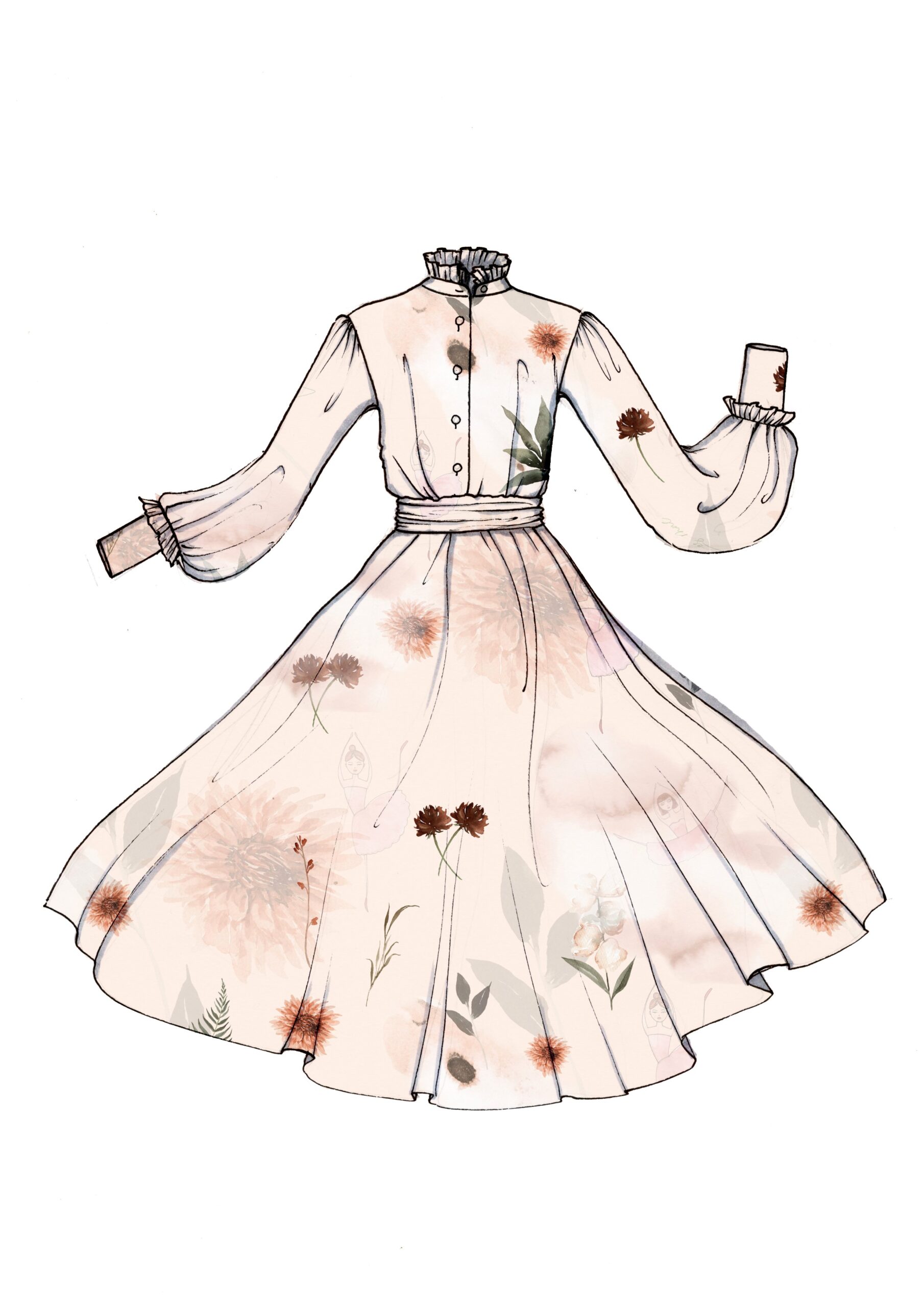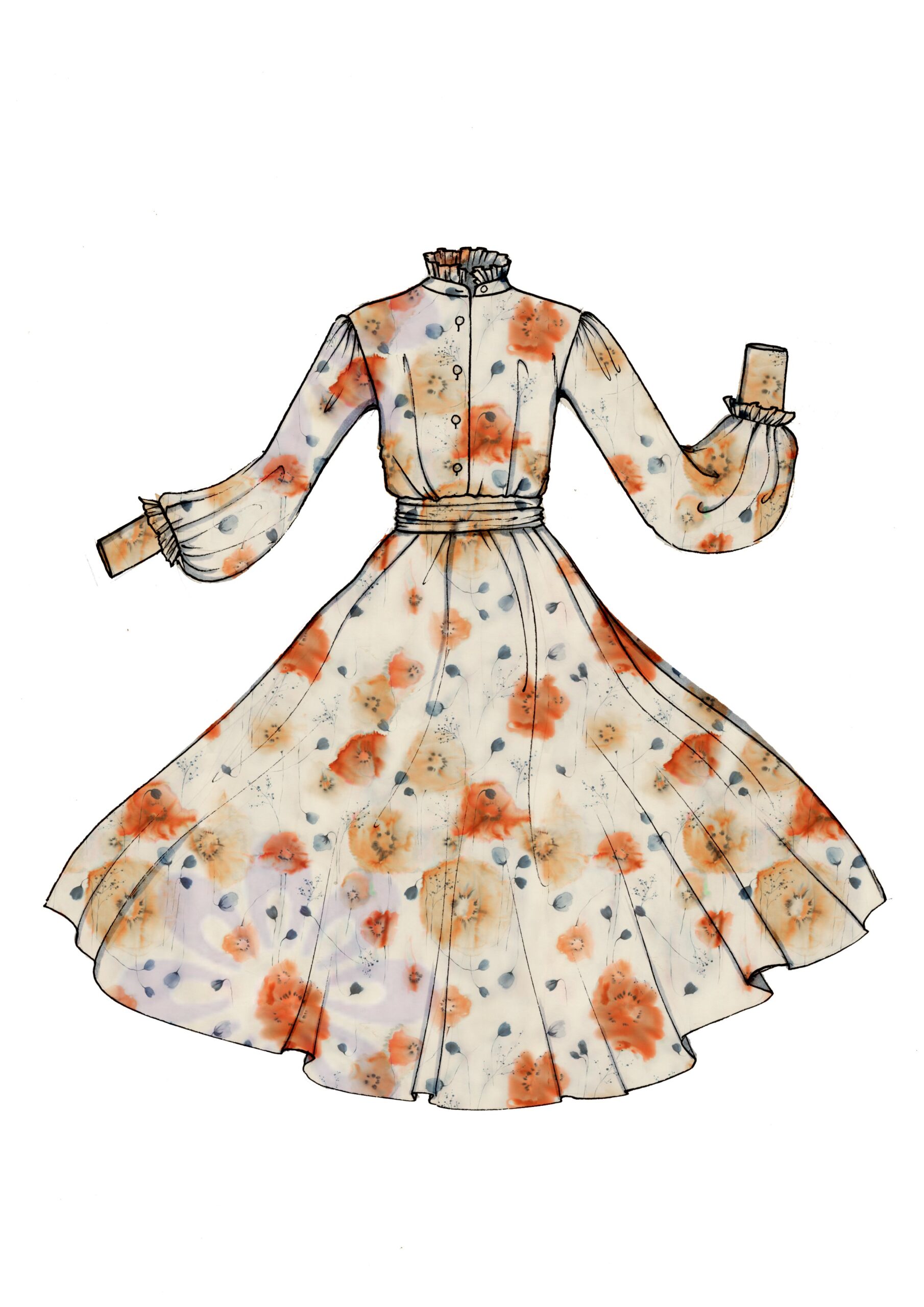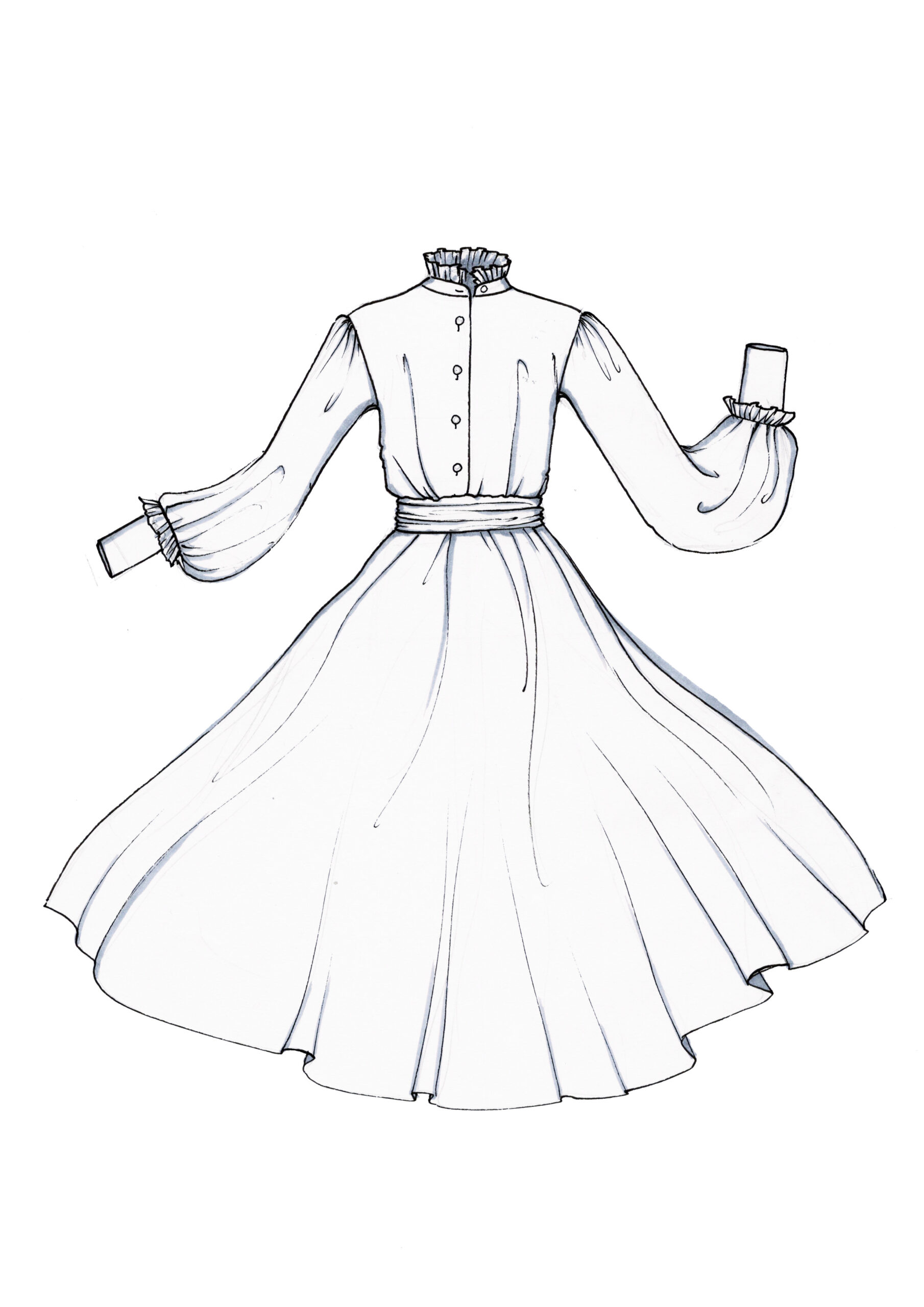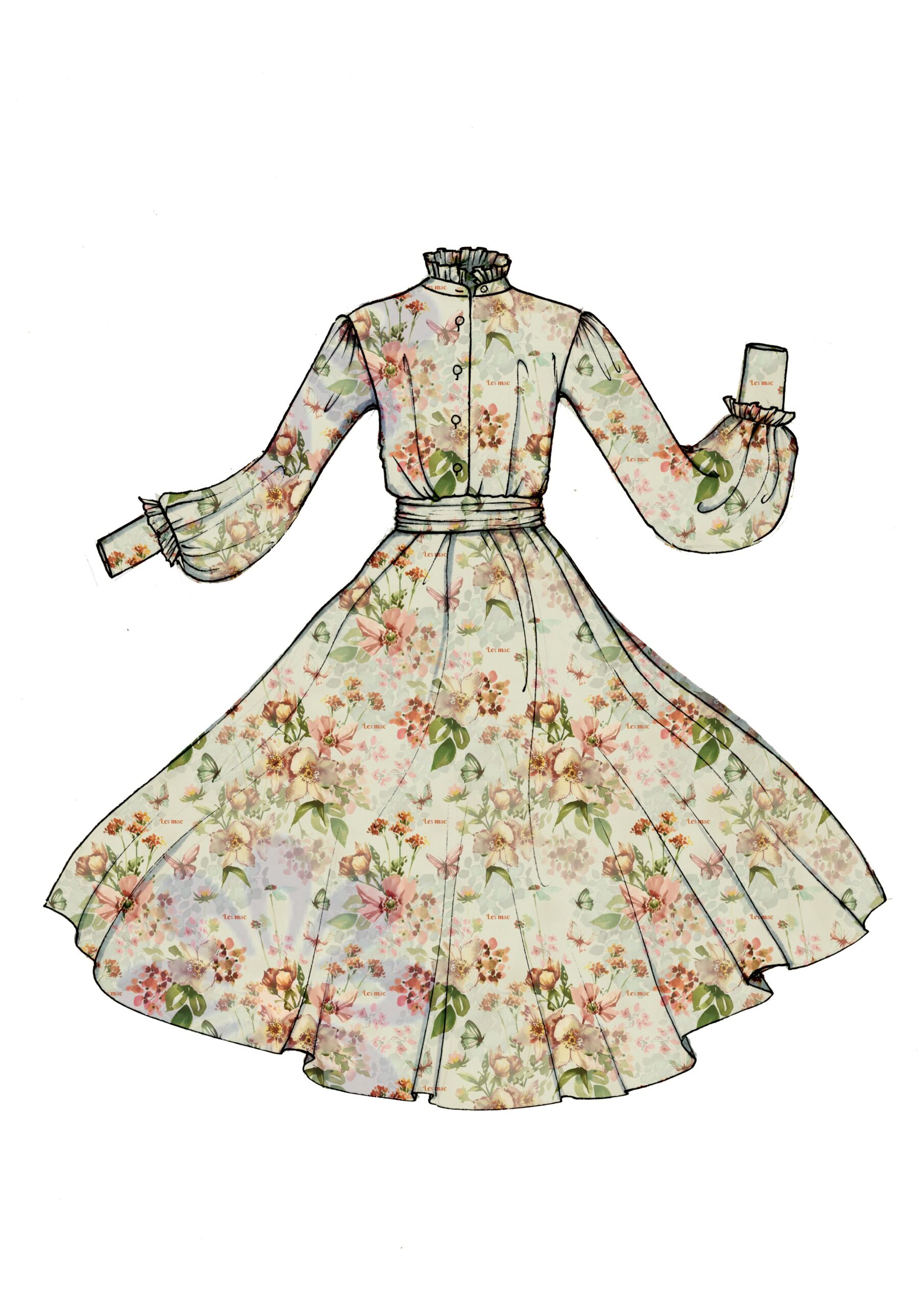 Il colletto alla coreana, impreziosito da un raffinato volant sartoriale, incornicia con grazia il décolleté. Le maniche ampie a sbuffo esaltano la leggerezza del gesto, mentre le morbide pieghe sulla cintura scolpiscono la silhouette con naturalezza. La gonna a ruota intera, arricchita da pratiche tasche invisibili, accompagna i movimenti con fluidità e charme.