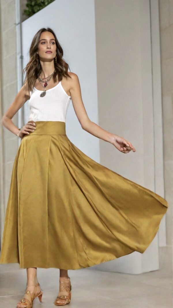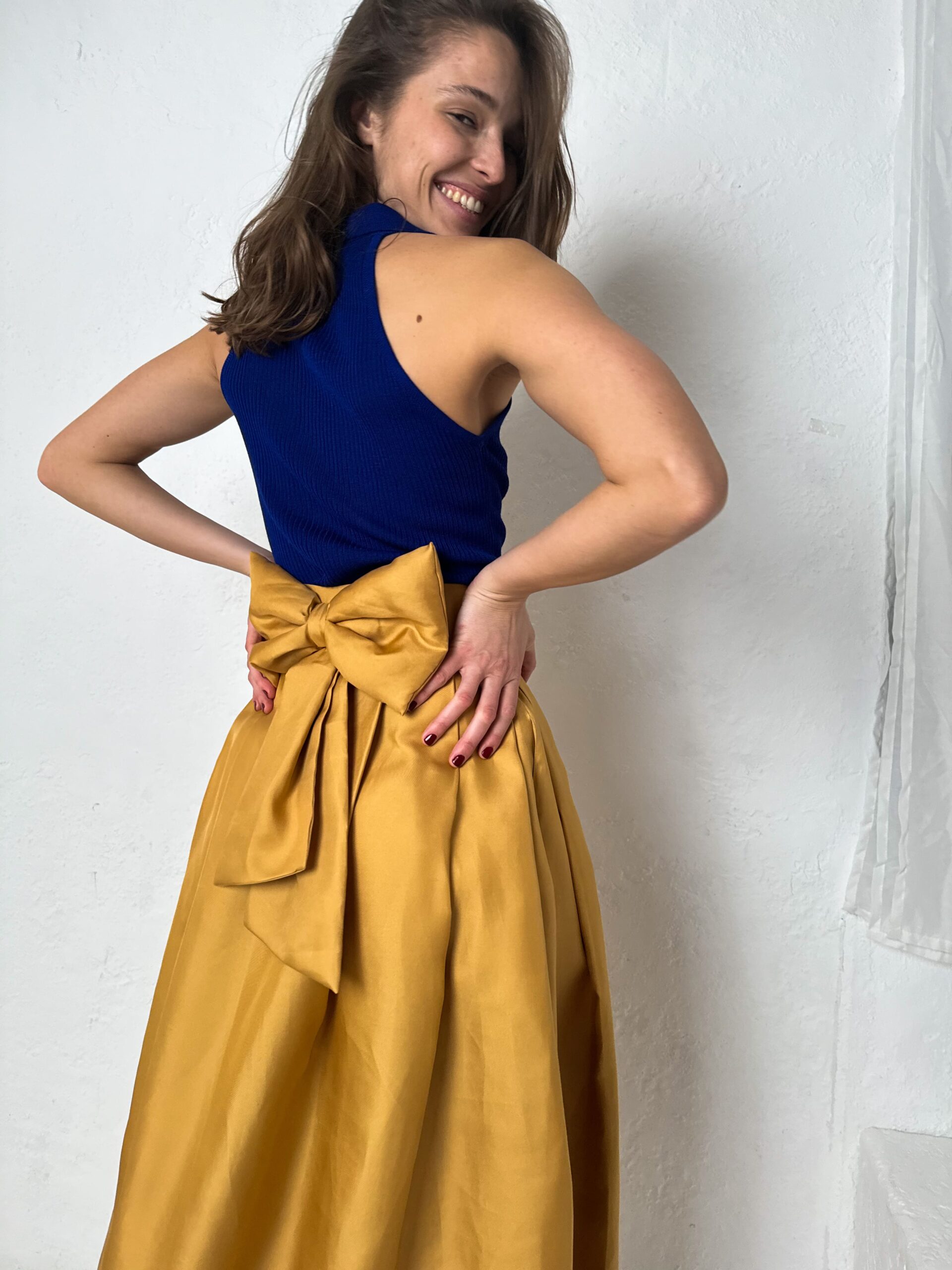 Gonne lunga con pieghe e fiocco imbottito sul retro, tasche inserite e cerniera sul fianco.