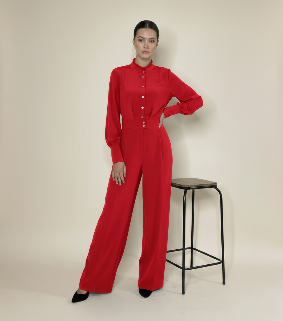 Tuta intera, con pantalone e palazzo e piccolo volant sul colletto alla coreana. Bottoncini in madreperla, polso alto a con manica a sbuffo.